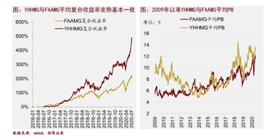 自2016年来,YHHMG(药明康德(02359)、海天、恒瑞、茅台、国免) 与FAAMG走势基本一致,PB的整体估值水平也基本类似。本轮公共卫生事件爆发后,FAAMG已经创历史新高,估值也创历史高。而YHHMG的估值也在前期高点。