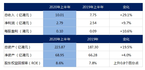 智通财经APP获悉,(2020年8月26日)交银国际控股有限公司(“交银国际”、“公司”,股份代号:03329)今日公布截至2020年6月30日止6个月的中期业绩,期内实现总收入10.01亿港元,净利润2.79亿港元,较去年同期分别增长29.1%及9.7%,中期收入、利润创上市以来新高;每股盈利0.10港元,同比增长10.6%;截至2020年6月30日,公司总资产为223.87亿港元,净资产为68.95亿港元,较2019年底分别增长19.5%及4.0%。年化股东权益回报率(ROE)8.6%,较2019年提升0.8个百分点。