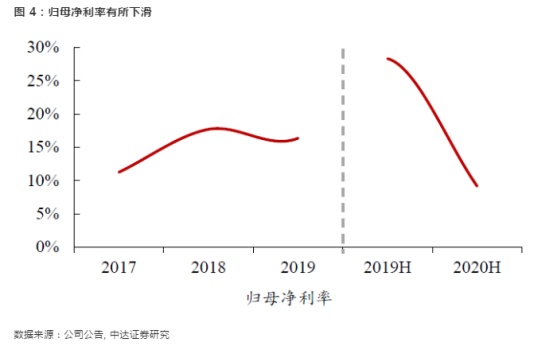 收入规模大幅增长,盈利水平有所下滑。德信中国(02019)2020年上半年实现营业收入76.5亿元(+117.5%),归母净利润7.0亿元(-29.7%)。公司归母净利润增速与营收增速出现较大差异,主要系:1)2020上半年结算项目的土地成本相对去年同期结算项目较高,毛利率下降8.9pct至25.7%;2)上半年结算项目权益比例有所波动,分占合联营公司业绩占营收比重大幅下滑15.4pct至6.8%、归母净利润占净利润比重下滑25.5pct至52.1%。整体而言,公司上半年营收规模实现了大幅增长,而土地成本和结算项目权益比例的变动则对归母净利率的下降造成了一定影响。