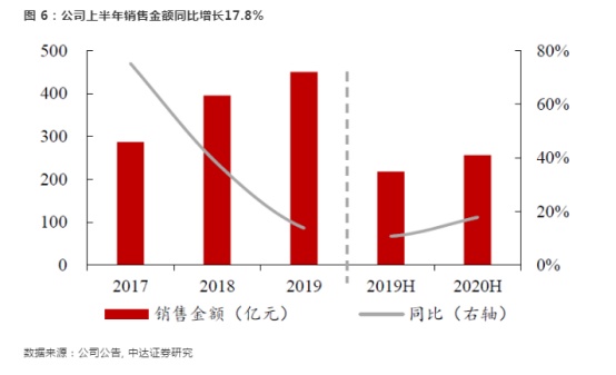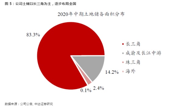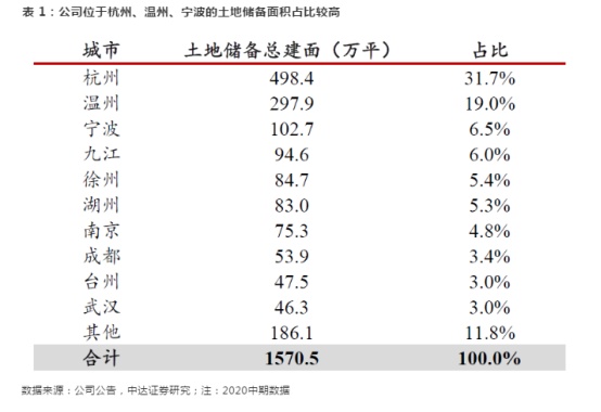 深耕优势区域长三角,布局全国重点城市群。2020上半年,公司积极扩展优质土储,新增土地储备286万平方米(其中约94%位于一二线城市),公司2020年中期土地储备面积达到1571万平方米。区域布局方面,公司继续深耕优势区域长三角,位于长三角的土储面积占比高达83.3%,其中位于杭州、温州、宁波的土储面积占比最高,占总土储面积分别达31.7%、19.0%和6.5%;同时,公司亦发力布局全国其他重点城市群,位于成渝及长江中游的土储面积合计占比和位于珠三角的土储面积占比分别达14.2%和2.4%。优质的区域布局使公司近月的合约销售快速回暖,2020上半年公司销售金额达257.1亿元(+17.8%),其中浙江省贡献占比达88.9%。总量充足、保持优质且更趋均衡的土地储备或将助力公司稳步实现可持续的规模增长。