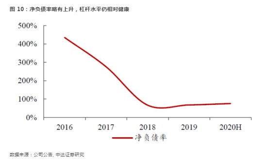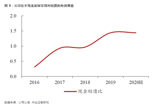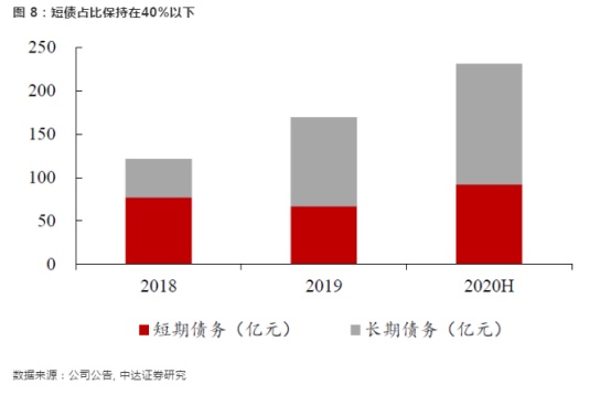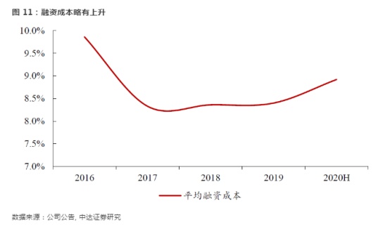 流动性表现良好,杠杆水平略有提升。在良好的销售表现和现金管控下,2020年中期公司现金总额较2019年末增长38.9%至132.9亿元,有息负债总额则较2019年末增长36.4%,短期债务占比继续保持在40%以下,现金短债比与2019年末持平,达1.4倍,能够实现现金对短期债务的有效覆盖。杠杆方面,由于土地收购及物业开发的借款增加,公司净负债率较2019年末提升7.6pct至76.3%,平均融资成本提升约0.5pct至8.9%。在当前的扩张阶段下,公司流动性表现保持良好,杠杆水平仍较为可控,随着未来的规模增长,公司财务状况有望迎来改善。
