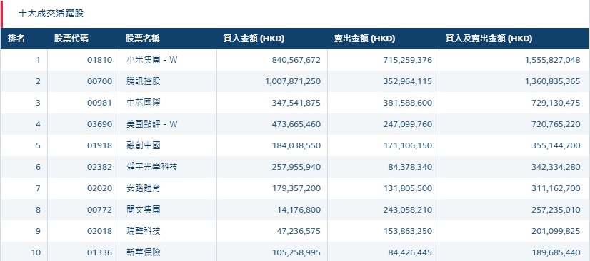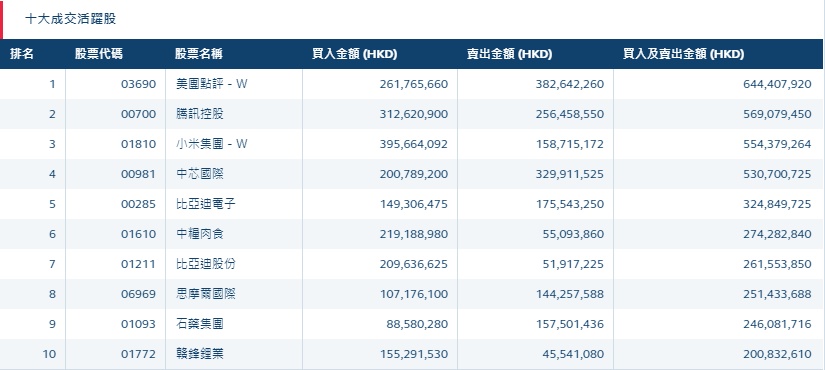 港股通(深)十大活跃成交股
