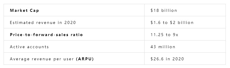 * Roku的用户基础今年跃升至3980万。年增长率为37%。然而,由于卫生事件导致用户被限制出行,这一增长率可能会提高。根据未来五年较低的增长率(每年约15%)进行调整,这意味着到2025年用户基数将翻一番,达到8000万。