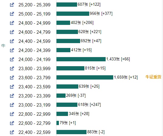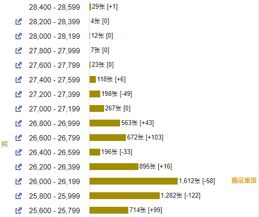 智通财经APP获悉,截至8月26日,恒指最新的牛熊街货比例63:37。摩根恒指牛熊证街货分布图中的数据显示,熊证街货重货区在26000-26199区间,该区间最新熊证数量为1612张,较上一交易日减少58张,最多新增26600-26799区间,该区间最新熊证数量为672张,较上一交易日增加103张。牛证街货重货区在23600-23799区间,该区间最新牛证数量为1659张,较上一交易日增加12张,最多新增区间在25000-25199区间,该区间最新熊证数量为956张,较上一交易日增加377张。