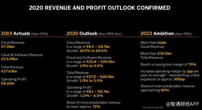 尽管全球经济环境仍存在许多不确定因素,SAP还是重申了2020年业绩指引以及2023年的目标。云计算收入的强度和弹性可能是该公司能够重申其之前的预测范围的主要原因之一。云计算营收预计将占总营收的30%,而云/软件营收约占总营收的85%,这些业务具备的高度重复特性使得预测收入更加容易。