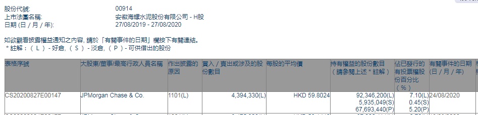 智通财经APP获悉,香港联交所最新资料显示,8月24日,摩根大通增持海螺水泥(00914)439.433万股,每股作价59.8024港元,总金额约2.63亿港元。增持后最新持股数目约为9234.62万股,最新持股比例为7.10%。