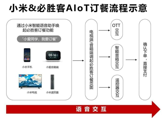 创造性地以小米OTT大屏为核心媒介展示必胜客菜单,同时支持多人语音协作点单(OTT、小爱音箱、手机均可识别),可以让家人七嘴八舌就把餐给订了。同时,创新升级声纹支付、人脸支付等快速支付系统,彻底解放双手。该案例实现了智能物联网订餐全路径服务,比如小米手机开放负一屏让用户实时查看送餐状态、小米智能门铃识别必胜客工服,OTT联动提醒;小米智能门铃识别到访人数提供定制化订餐建议;小白摄像机识别家庭成员,提醒订餐送关怀等等AIoT黑科技服务。