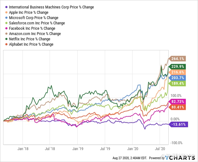 在包括微软(MSFT.US)和Salesforce(CRM.US)等科技股集体大涨之时,IBM却被排挤在外。在过去的3年里,上述公司都在大幅上涨,而IBM却下跌了约13.6%。