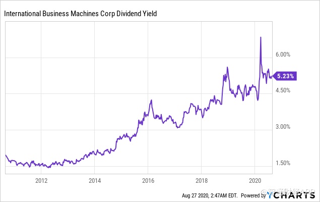 尽管如此,IBM连续25年都增加了股息,现在的股息收益率超过5%,远高于其长期平均水平,非常有吸引力。下图显示了该公司股息率在十年间的变化。
