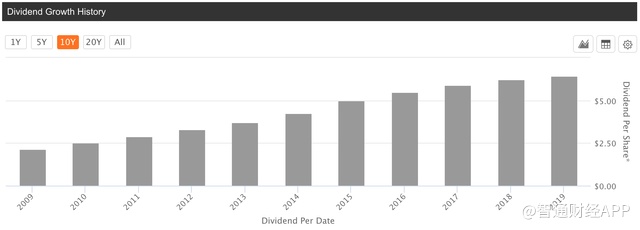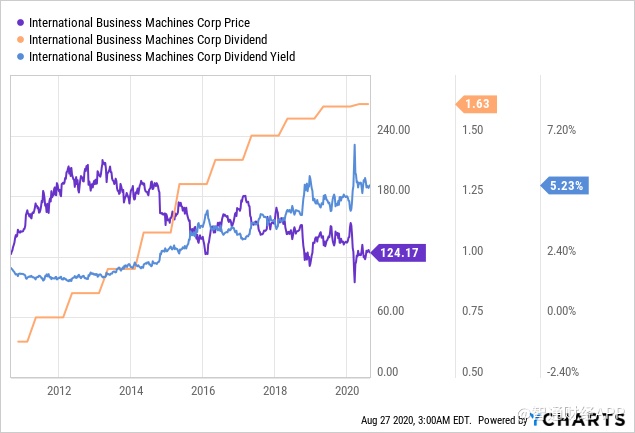 股息率不断提高的原因很简单。该公司每年都在提高股息,但股价却毫无起色。如下图所示,IBM在2009年至2019年这十年间一直在提高股息,该公司股息在过去10年的复合年均增长率(CAGR)为11.58%。