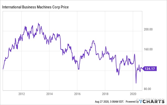 下图显示了IBM股价十年间的表现,股价几乎毫无起色。