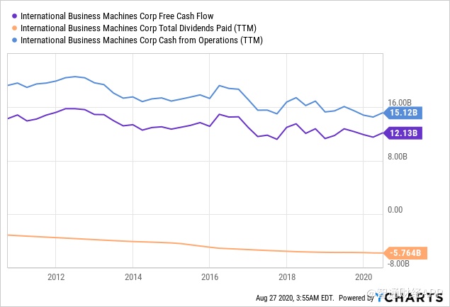 更重要的是,尽管IBM在过去几年处于转型模式,公司对传统部门进行清算同时扩张其云计算业务,但IBM仍在继续产生有吸引力的现金流。在过去的12个月里,经营现金流净流入151亿美元,自由现金流为115亿美元,而支付的股息总额约为60亿美元。换句话说,IBM将大约一半的自由现金流用于支付股息。