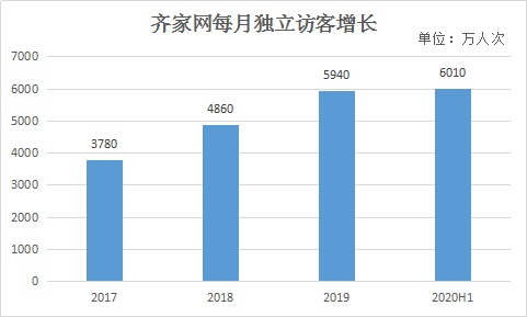 上半年内,齐家网线上平台的用户粘性和新用户的增长依然保持强劲增长。财报显示,2020上半年,齐家网每月独立访客由上年同期的约5510万名增加9.1%至6010万名;推荐用户数目较上年同期增加14.1%至257,801名;期内所作出的推荐数目同比增长11.0%至610,358个。