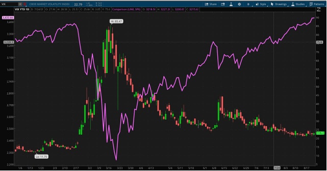 从该图可以看到,VIX指数已经接近公共卫生事件后的低点,不过还没有到2020年初卫生事件爆发前的水平。与此同时,标普500指数(紫线)自4月份以来几乎一直都处于上涨态势,并且创下了历史新高。但是,有部分投资者担心,随着大选临近,VIX指数可能在9月份开始攀升。