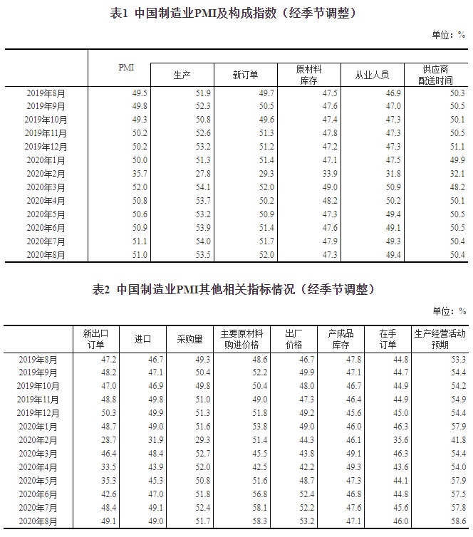 8月份,中国制造业采购经理指数(PMI)为51.0%,比上月略降0.1个百分点,表明制造业总体平稳运行。