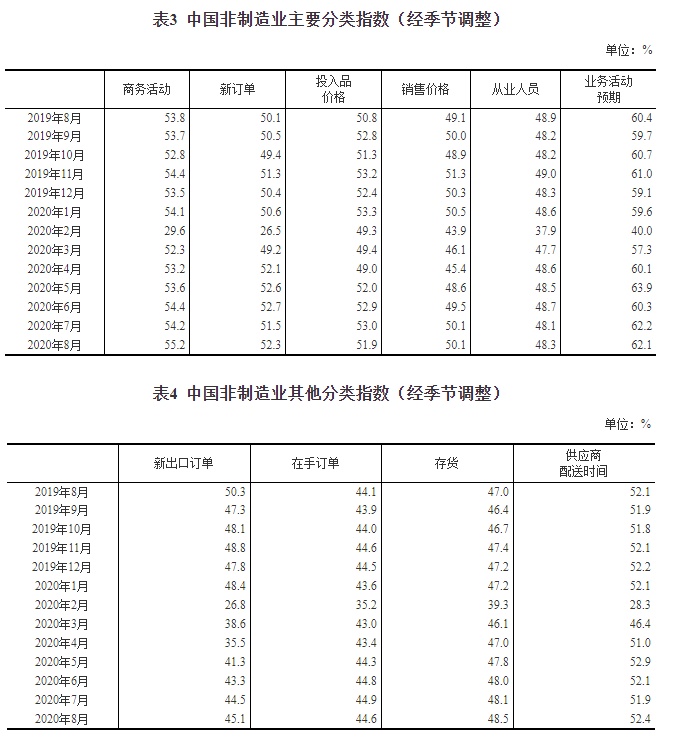 8月份,各地积极贯彻落实党中央决策部署,坚持新发展理念和稳中求进工作总基调,统筹卫生事件防控和经济社会发展成效显著,我国经济景气持续恢复向好。制造业采购经理指数为51.0%,比上月略降0.1个百分点,非制造业商务活动指数和综合PMI产出指数为55.2%和54.5%,分别高于上月1.0和0.4个百分点,三大指数均连续6个月保持在临界点以上。