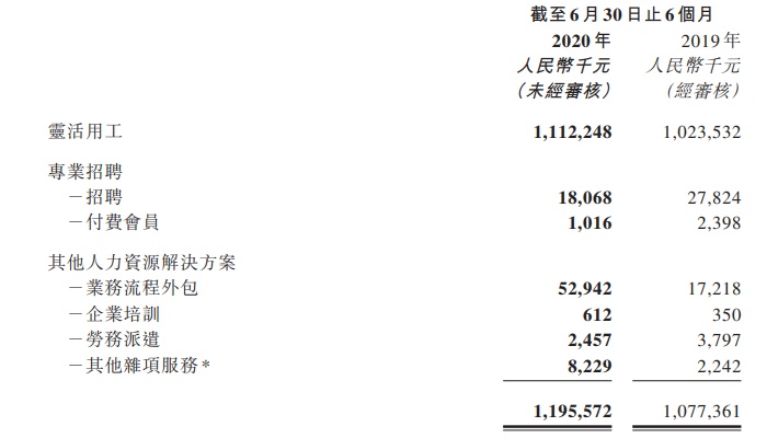 其中,灵活用工仍是“扛把子”业务,占总收益百分比93%,上半年实现收入高达11.1亿元,同比增长8.7%。截止6月30日,其灵活用工在岗人数由2019年同期的20156人,上升至28257人,同比增加超过40%。