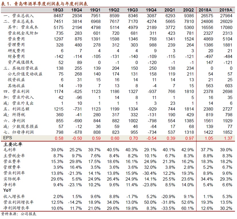青岛啤酒(00168)20Q2收入业绩增长9%/60%,业绩超出市场预期,主要受到吨价提升+成本节约+费用率下降的推动,由此带动净利率大幅提升,我们在8月18日的报告《啤酒最新跟踪:逐季改善,中报高增》的逻辑得到验证。展望H2,夜店、商务餐饮等渠道全面恢复营业,中高端产品将恢复较快增长,同时公司继续加大推广灌装产品,罐化率继续提升,H2业绩可期。中长期来看,公司高端化及产能优化的核心逻辑不变。上调20-22年盈利预测22.8、26.7和30.6亿,目标市值1435亿,对应A股目标价106元,维持“强烈推荐-A”评级。