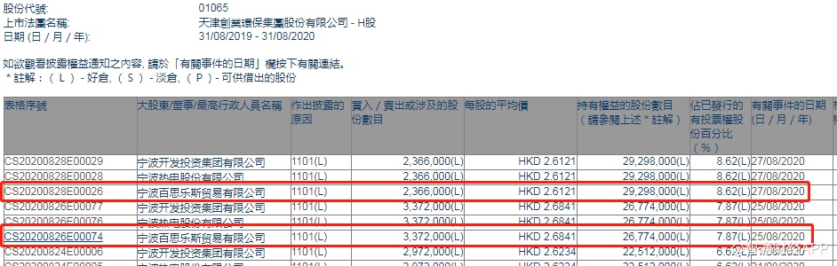 智通财经APP获悉,香港联交所最新资料显示,8月27日、28日,宁波百思乐斯贸易有限公司分别增持天津创业环保(01065)337.2万股、236.6万股,每股作价分别为2.6841港元及2.6121港元,总金额约为1523.10万港元。增持后最新持股数目为2929.8万股,最新持股比例为8.62%。