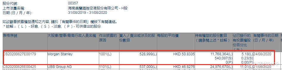 智通财经APP获悉,香港联交所最新资料显示,8月24日,摩根士丹利增持美兰空港(00357)52.9万股,每股作价50.8335港元,总金额约为2689.09万港元。增持后最新持股数目为1176.84万股,最新持股比例为5.18%。