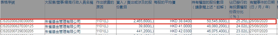 智通财经APP获悉,香港联交所最新资料显示,8月26日,朱雀基金增持赣锋锂业(01772)246.56万股,每股作价38.84港元,总金额约9576.39万港元。增持后最新持股数目约为5054.58万股,最新持股比例为25.25%。