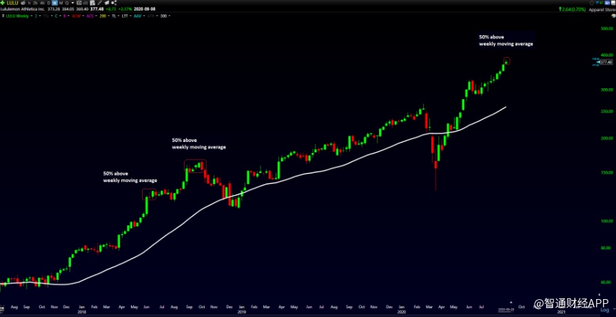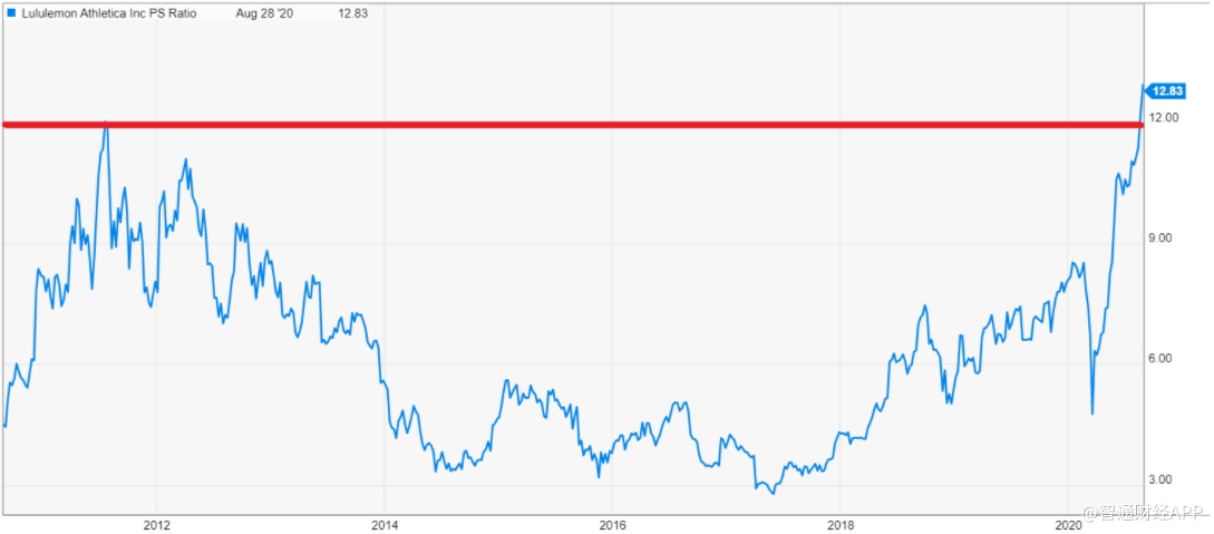 虽然Lululemon的增长是巨大的,而且没有什么比一家能够相对无损地度过卫生事件的公司更令人印象深刻的了。但当Lululemon的估值与销售额之比超过12.8倍时,投资者就会发现现在的价格获得了不合理的增长。从下图中可以看到,12倍的市销率是该股在过去10年的上限,并且在上次达到这个水平时标志着该股的股价到顶了。考虑到甚至很少看到高增长科技股的市盈率超过15倍,这是该股面临的风险之一。