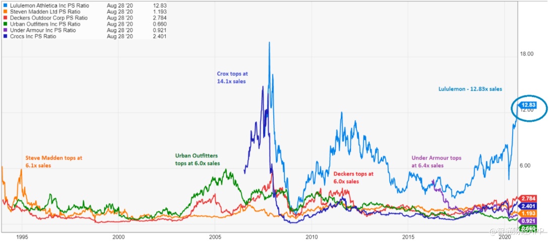 (SHOO.US)的市值在20世纪90年代达到销售额的6.1倍,Urban Outfitters (URBN.US)在2005年达到销售额的6.0倍,而Deckers