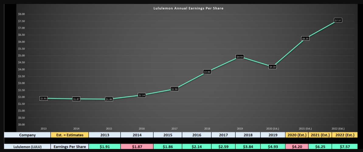 从上面的盈利趋势中可以看到,Lululemon在过去几年中有着令人难以置信的盈利趋势,自2015财年以来,其每股收益的复合年增长率为27%。然而,鉴于2020年上半年的利润率轻微压缩和销售疲软,预计2020财年每股收益将下滑15%,从4.93美元下滑到目前预计的4.20美元。但这只是长期趋势中的一个小插曲,2021财年和2022财年的每股收益预测目前在6.25美元和7.57美元。因此,尽管一些投资者可能对该股今年的表现感到挠头,年度每股收益大幅缩水,但需要注意的是,2020财年是长期趋势中的一个偏差,市场总体上是看9个月之后。