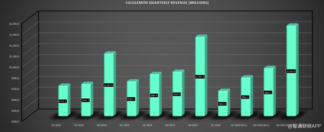 季度末,Lululemon将以5亿美元收购Mirror,这是它第一次真正进军家庭健身市场。如果消费者更喜欢瑜伽和有氧运动,而不是PTON提供的动感单车课程,该产品为他们提供了一种在家进行互动锻炼的方式。然而,Mirror的前期售价高达1500美元。虽然投资者通常对1500美元的标价和39美元/月的经常性成本持怀疑态度,但Lululemon目前的产品已经迎合了高端消费者的需求,所以它有可能通过这一新产品加速增长。如果成功的通过Mirror提高了基础收入,这对Lululemon来说将是一件成功的交易,因为没有什么比经常性收入更好的了。即使未来没有增长,根据目前的估计,这笔交易也有望为Lululemon增加1亿美元的年收入。