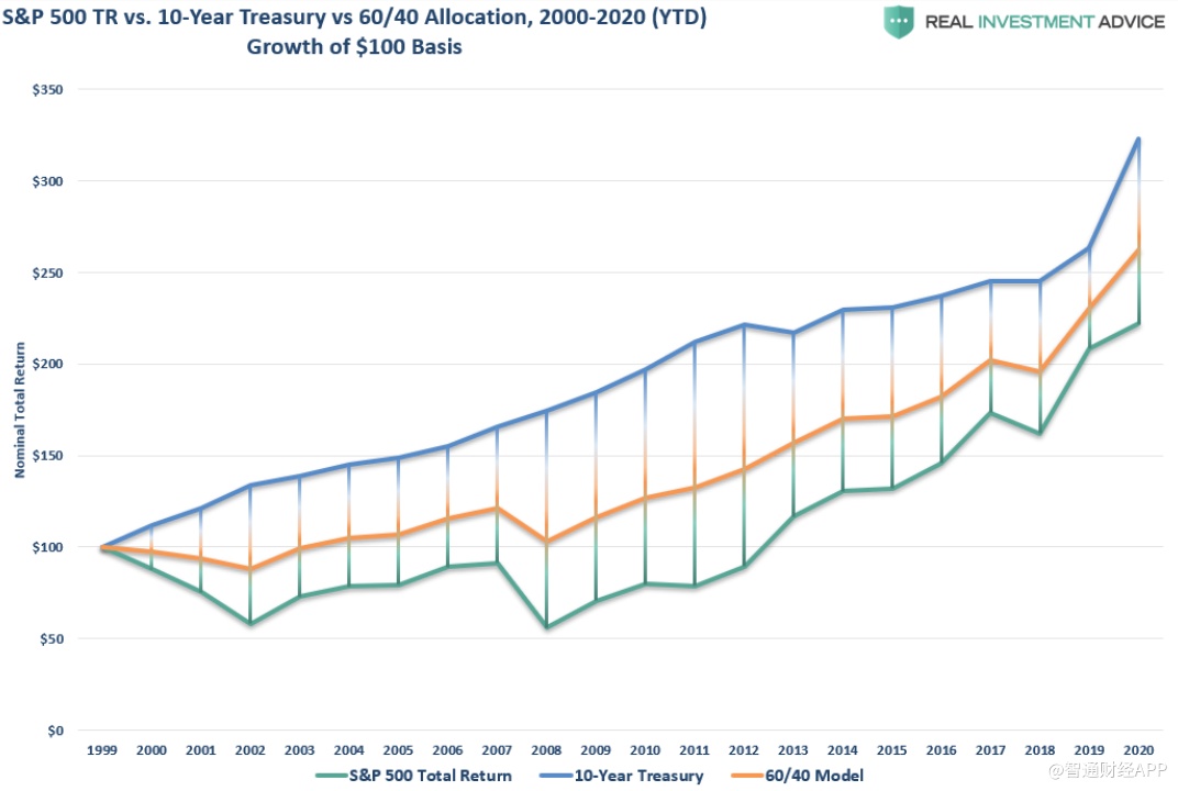 从2000年至今,哪一种资产的回报率更高?从图中明显能看到,美国国债的回报率更高。