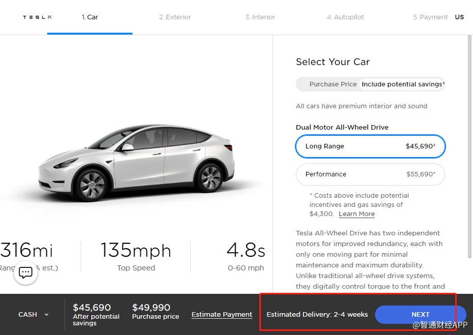 智通财经APP获悉,特斯拉(TSLA.US)官网信息显示,Model Y车型的交付时间从4-6周缩短到了2-4周。这意味着北美客户现在订购汽车就能够在第三季度结束前收到。