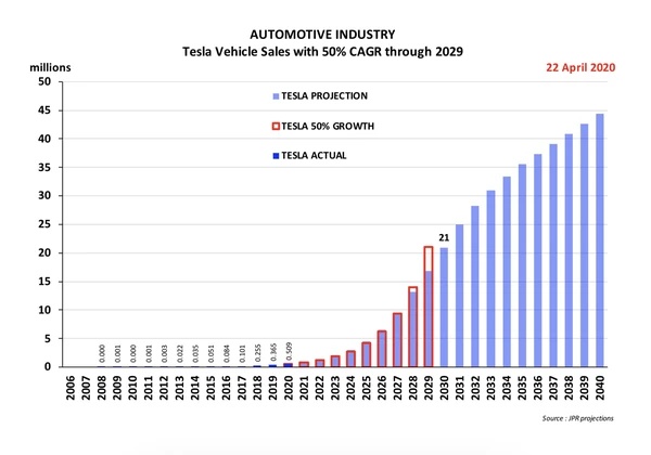 因此,该投资者调整了对特斯拉的预测,假设特斯拉将以恒定的超过50%的增长率增长:
