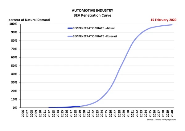 假设其他行业与特斯拉保持同步增长频率,那么此S曲线将表现出纯电动汽车行业的总体预计渗透率。