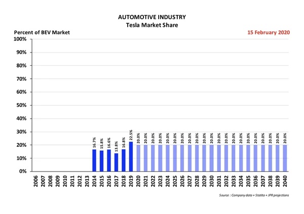 这种分析方法将会揭示特斯拉将会在全球纯电动汽车行业中占据稳定的20%的份额,如下所示:
