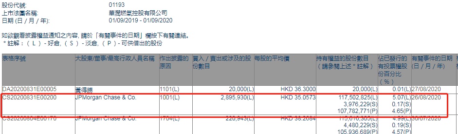 智通财经APP获悉,香港联交所最新资料显示,8月26日,摩根大通增持华润燃气(01193)289.593万股,每股作价35.0573港元,总金额约为1.02亿港元。增持后最新持股数目为1.18亿股,最新持股比例为5.07%。