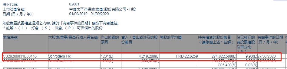 智通财经APP获悉,香港联交所最新资料显示,8月27日,Schroders Plc减持中国太保(02601)421.92万股,每股作价22.6259港元,总金额约9546.32万港元。减持后最新持股数目为2.75亿股,最新持股比例为9.90%。