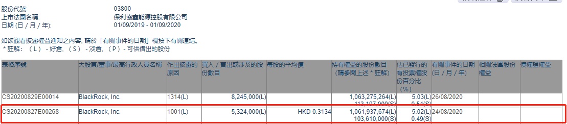 智通财经APP获悉,香港联交所最新资料显示,8月24日,贝莱德增持保利协鑫能源(03800)532.4万股,每股作价0.3134港元,总金额约为166.85万港元。智通财经APP获悉,增持后最新持股数目为1.06亿股,最新持股比例为5.02%。