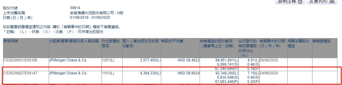 智通财经APP获悉,香港联交所最新资料显示,8月24日,摩根大通增持海螺水泥股份(00914)439.433万股,每股作价59.8024港元,总金额约为2.63亿港元。智通财经APP获悉,增持后最新持股数目为9234.62万股,最新持股比例为7.10%。