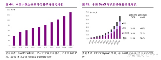 此外OliverWyman也表示,2013年至2019年,我国SaaS市场规模年均复合增速达到31.5%,增长十分迅猛,且预计未来仍将保持高速增长,预测数据显示2020-2023年SaaS市场规模CAGR有望达到34.4%。