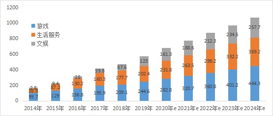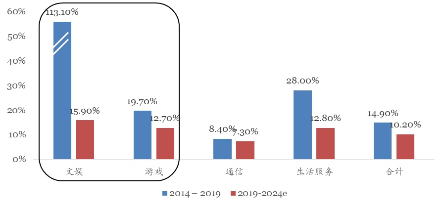 我们可以把行业的市场规模进行简单的测算,行业规模=付费品类X付费人数X付费金额。未来五年这三个维度都将持续提升,从细分行业的增长来看,文娱、游戏、生活服务行业未来5年的复合增长分别高达15.90%、12.70%、12.80%,依然保持强势增长。