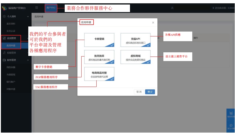 TSC:虚拟商品消费场景可使用我们的TSC应用程序管理不同电商平台上的网店。我们的TSC服务亦使虚拟商品提供商可上货和集中管理不同电子商务平台上的网店,节省了虚拟商品提供商需要向每个电子商务平台手动上货其虚拟商品的时间。