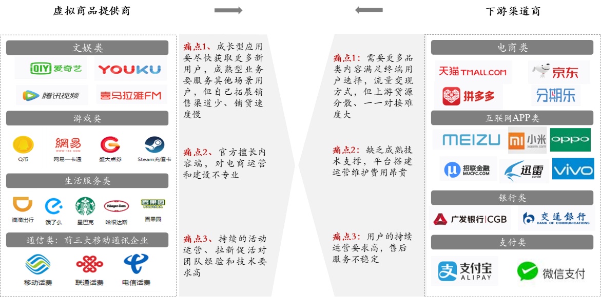 在第三方虚拟商品市场中,上下游有各自面临的痛点和问题。上游的虚拟商品提供商的最大诉求是更高效率、更短时间去覆盖更多的用户,但自己对接下游的各类渠道商的速度慢、商务周期长;上游官方擅长的是内容端,而对电商运营、建设等不擅长、非重点工作;商业化运营需要持续的活动运营、拉新促活等,对行业的运营经营、定制化解决方案、技术实现要求高。