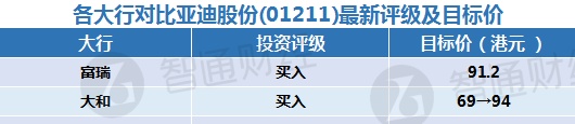 二、各大行对比亚迪股份(01211)最新投资评级与目标价