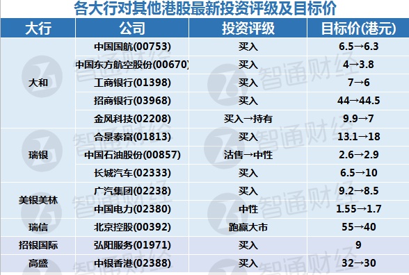 六、各大行对其他港股最新投资评级及目标价