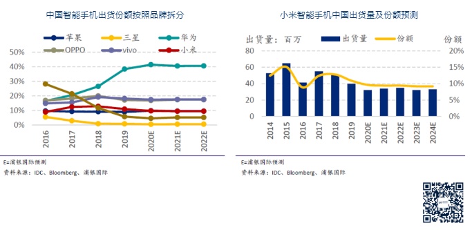 在2019年5月,华为被加入美国实体清单之后,就将大量资源向中国国内市场倾斜。这给小米、OPPO、vivo等在国内市场的销售很大的压力。我们也留意到小米在国内智能手机的份额也从2019年上半的12%下滑到2019年下半年的9%-10%之间。但是,即使在这样的情况下,小米依然保持住了线上的份额,并且努力向高端拓展。我们认为未来小米在中国智能手机的基本份额在9%左右的位置,也就是大约每年3500万部的量。这是小米在中国可以坚守住的战场。