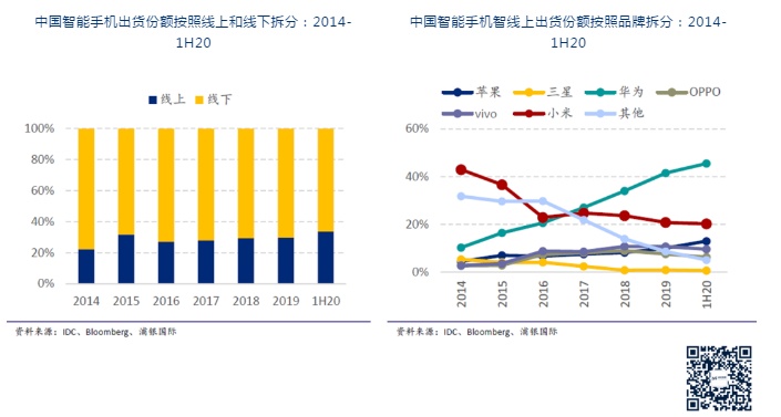 2020年上半年,受到卫生事件的影响,中国线上销售比例显著提升。根据IDC,中国智能手机线上销售比例显著提升,从2019年的30%提升到今年上半年的34%。展望未来,虽然一季度是卫生事件下的特别情况,但是,我们判断未来中国线上的比例依然会有攀升。这与中国整体实物商品消费线上化的比例提升是保持一致的。我们互联网分析师预计中国实物商品线上渗透率有望从2019年的20.7%提升到2021年的27.5%。相对来说,中国智能手机线上销售比例比线上中国实物商品整体销售比例要高10个百分点。