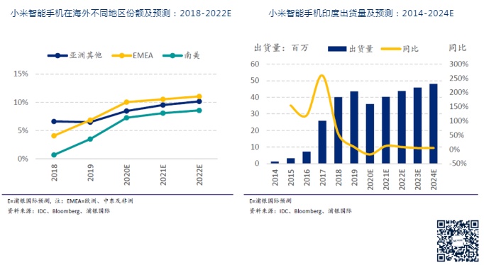 在2019年,小米在印度地区的智能手机出货量超越自己在中国地区的出货,达到4400万部,同比增长8.5%,贡献了小米手机出货量的35%。并且连续两年夺得印度智能手机出货量第一。我们认为小米未来两年在印度继续增加份额带来的空间相对比较小,更多成长将来自于印度手机用户从功能机向智能手机转换带来的智能手机的成长。在2021年和2022年,小米在印度的智能手机出货量预计将成长13%和8%,与印度整体智能手机出货量的成长类似。