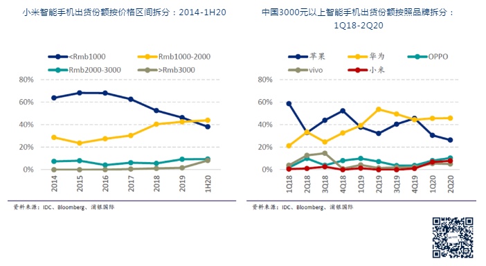 过去几年,小米在高端智能手机,或者说是高于人民币3000元价位段的手机布局并不顺利。在2019年,小米智能手机总出货量中高于人民币3000元以上占比只有2%。但,也是在2019年,我们看到小米公司进军高端的策略布局。未来两年,我们将见证小米在高端智能手机的表现,同时也进一步改善小米智能手机的产品组合,拉动小米智能手机平均单价的提高。