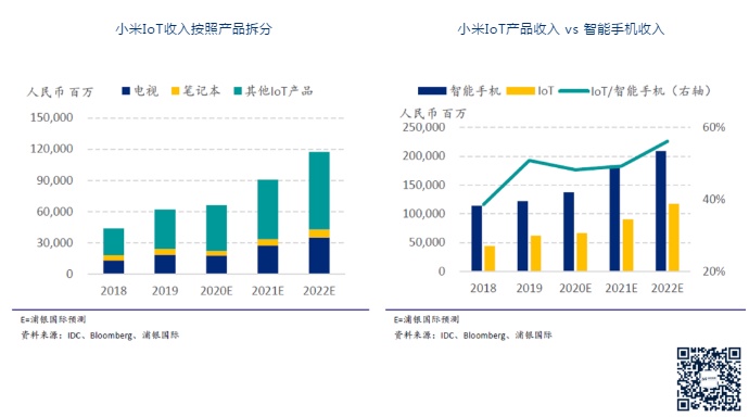 小米的IoT(Internet of Things,物联网)业务是小米过去三年增长最快的业务板块,2016-2019的复合增速达到了71%。我们预计未来三年这个板块的业务将依然保持小米三大业务板块中最高的增速,2019-2022E的复合增速将达到24%。