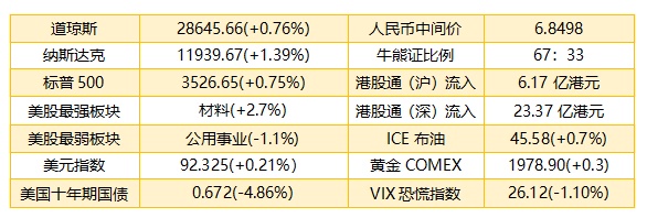 1、 美东时间周二,美股三大指数集体收涨。道指涨逾200点,纳指和标普500指数再创收盘新高。截止收盘,道指涨215.61点,涨幅0.76%,报28645.66点;纳指涨164.21点,涨幅1.39%,报11939.67点;标普500指数涨26.34点,涨幅0.75%,报3526.65点。港股ADR指数未能跟涨,按比例计算,收报25149点,跌34.79点或0.14%。